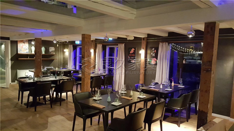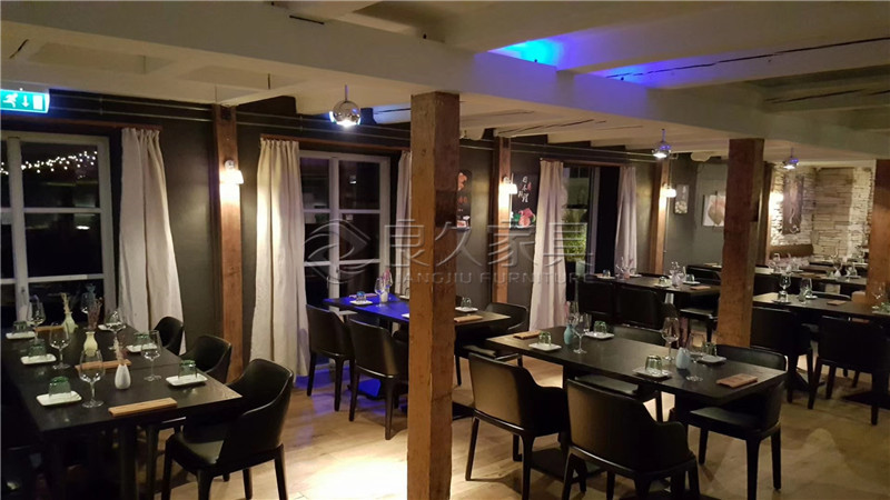 For the seating areas away from the bar, small round tables were custom-made. The tabletops were made of laminated plywood with a beautiful veneer finish that mimicked the look of natural wood but was more resistant to scratches and spills. The edges were rounded for safety and a softer