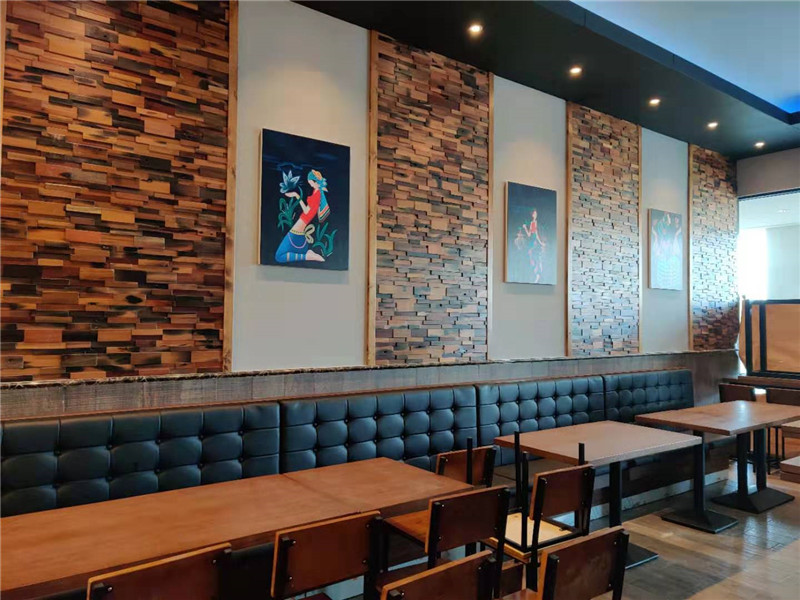 The restaurant features a variety of furniture. There are several wooden tables with metal legs, which are placed on the floor. Along the walls, there are cushioned benches with dark upholstery. In addition to the benches, there are wooden chairs with metal frames placed around the tables. The