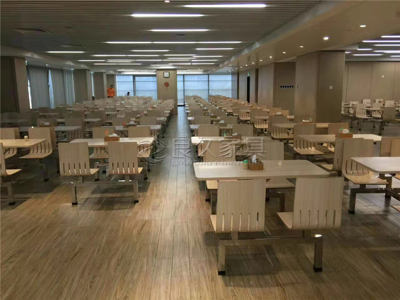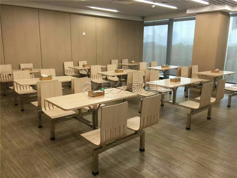 The chairs are also made of light - colored wood, matching the tables. They have a simple, functional design with vertical slats on the backrest, which not only provides comfort but also contributes to the modern aesthetic.
