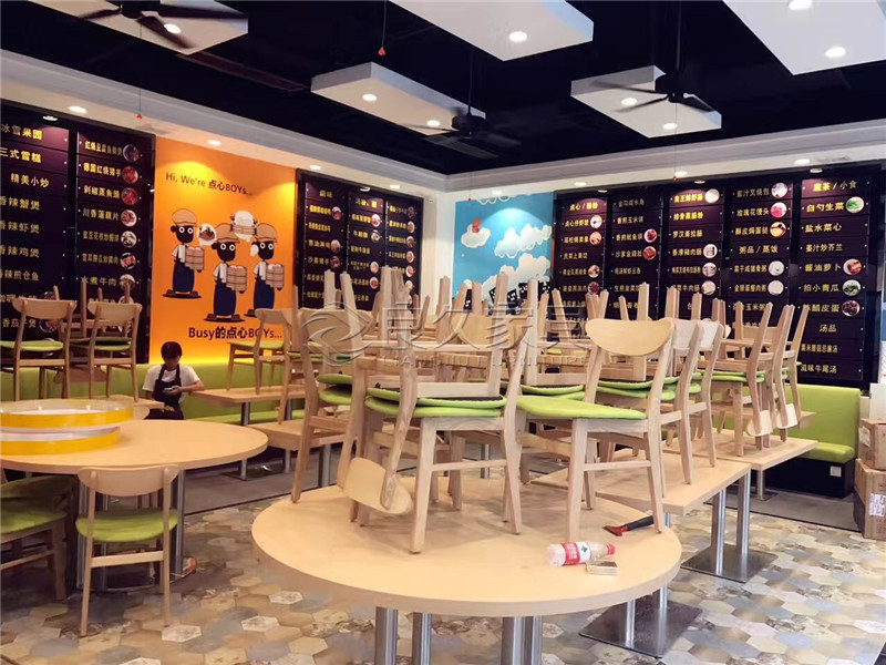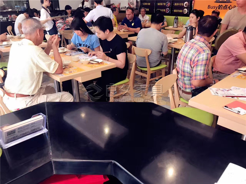 Design: Square or rectangular tables are common. The tabletops could be made of laminate or wood with a glossy finish for easy cleaning. The edges could be rounded for safety. Some tables could have a small shelf or rack underneath for storing condiments or menus.